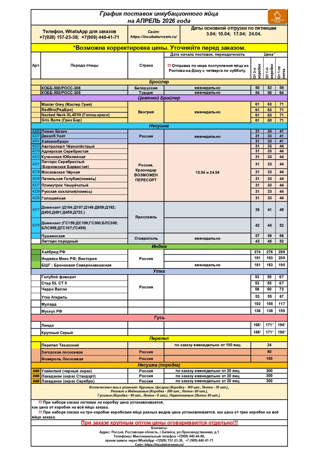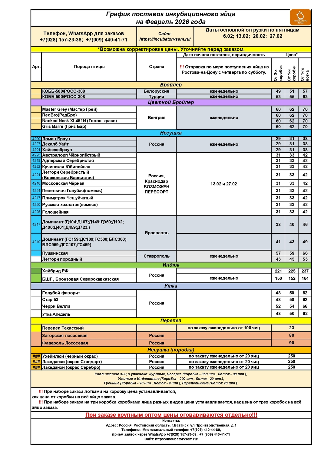 Примерные даты отправок указаны на нашем прайсе по инкубационному яйцу на месяц..